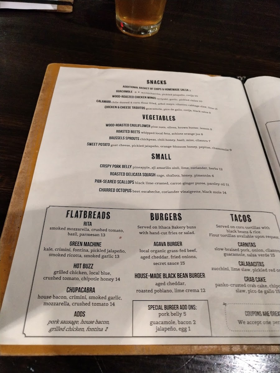 At Agava Ithaca, the menu offers a delightful blend of flavors that cater to a variety of tastes. One of the standout features is their wide range of beverages, such as Margaritas, including the refreshing Classic Margarita and the unique Chili Infused Mezcal Margarita. For beer lovers, there’s a selection of options to complement your meal perfectly.